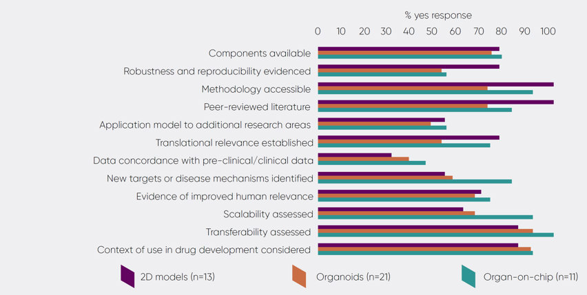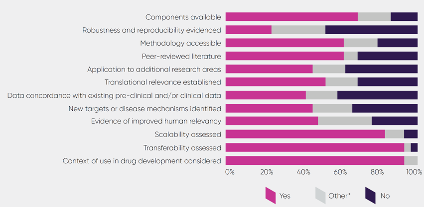 - The translational relevance. Evidence of translational relevance provide confidence that the model functions as it is intended to. Demonstrating translational relevance through clear translational endpoints was cited as a priority for several of the industry scientists consulted. 52 per cent of respondents reported that their models had been validated and could demonstrate translational relevance with clear functional endpoints. Where this had not been completed, additional feedback provided indicated that the work was ongoing or there was early evidence of this being assessed.