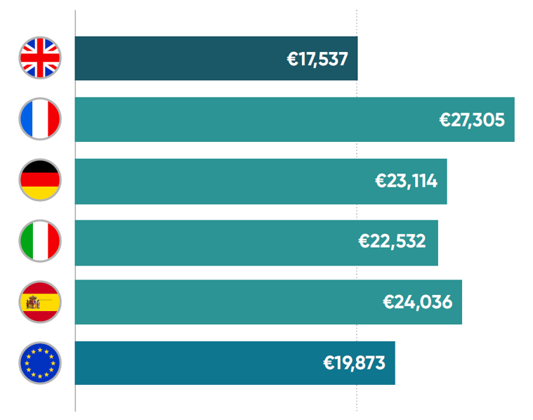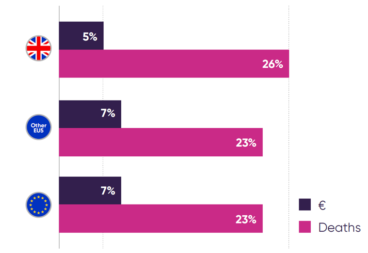 Cancer accounts for a significant share of UK deaths, yet spending on cancer care and medicines is far below the level needed for its disease burden – five times less than cancer’s share of total deaths – and among the lowest in Europe, ranking 13th per patient and lowest among the EU5 (France, Germany, Italy, Spain, UK).