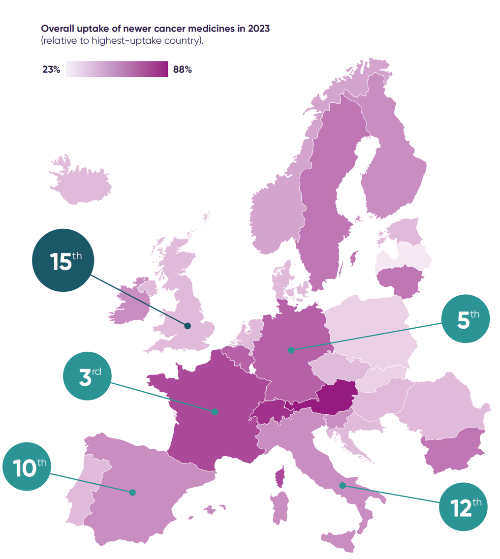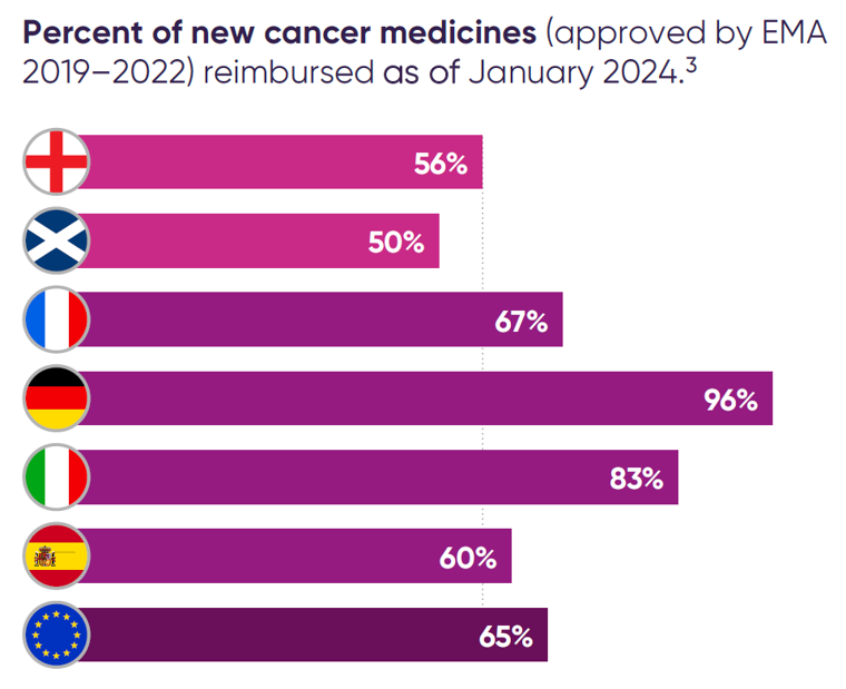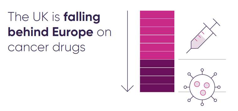 The UK is falling behind its European counterparts in access to cancer medicines. For example, in less a decade, England has dropped from being first in Europe for granting access to new treatments, including for cancer, to sixth for all medicines and tenth for cancer medicines5