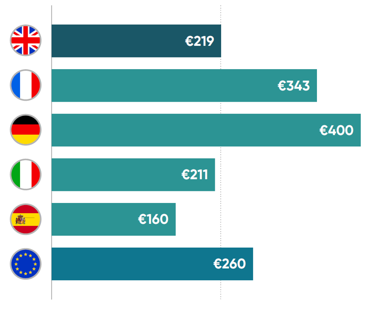 Cancer care spending per capita in euros (PPP-adjusted) in 2023.
